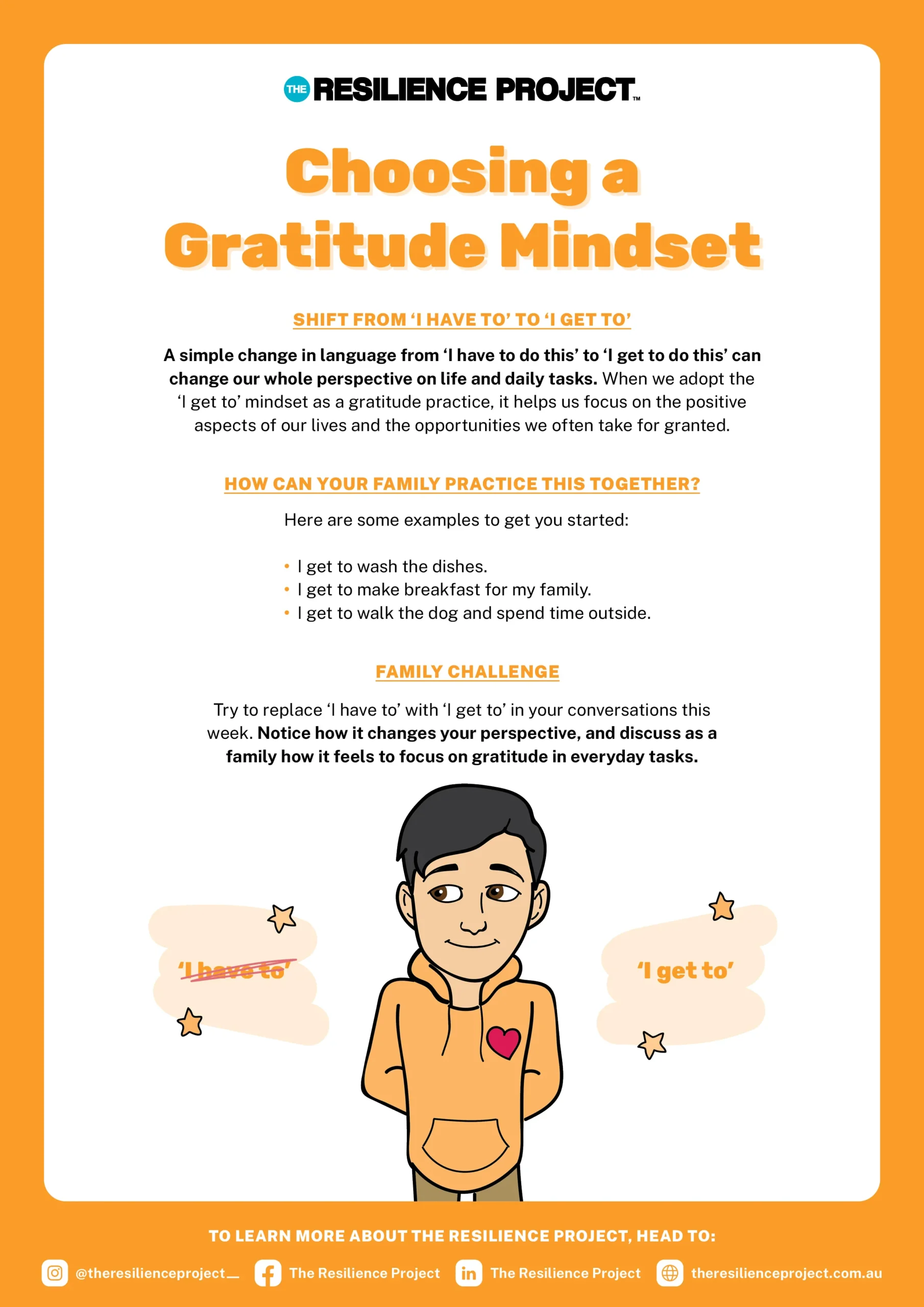 The Resilience Project encourages a simple yet powerful shift with Gratitude: moving from “I have to” to “I get to.” This small change in language can transform how we experience everyday tasks and help us appreciate the moments we often take for granted.